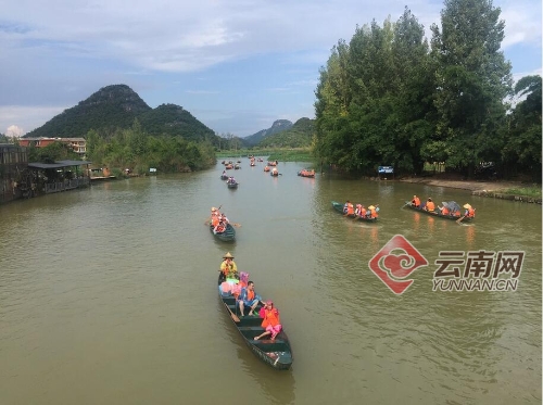 越来越多的游客在普者黑湿地公园水道乘船玩耍