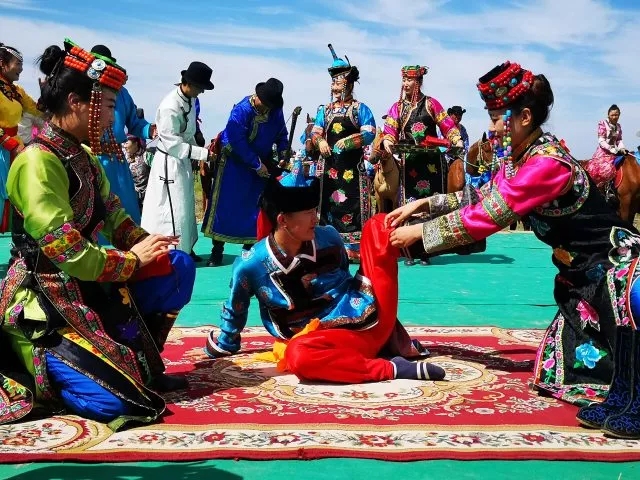 快到女方毡房时,迎新马队很快到女方家报讯请安,草原上妙趣横生,别开生面的闭门礼开始了。