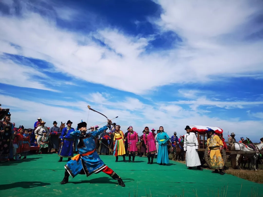 送亲的队伍出发了,一路上新郎、新娘在长辈们指点下,一路祭拜山神、土地、途中新郎发出一箭,箭落地就是长生天指引的吉祥之地,新郎、新娘下车、下马在此地举行隆重的仪式,感谢长生天赐于他们的幸福,感谢草原赐给他们新的生活。