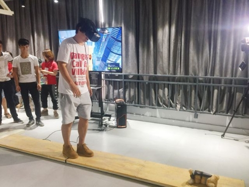 在山路骑行体验区,体验者需佩戴VR眼镜骑车,屏幕上的山路场景会随移动转换,时而上坡、时而急转弯、时而平缓……车身也会随场景左右摆动。在高空涉险体验区,参与者小心翼翼的在平地上移动着脚步,原来在vr的世界里面,体验者正站在高楼外狭窄的木板上试图“营救”蜷缩在木板尽头的“虚拟”小猫。