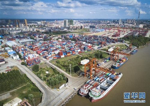 工人在武汉长江中游航运中心核心港阳逻港进行装载作业(8月13日无人机拍摄)。新华社记者肖艺九/摄
