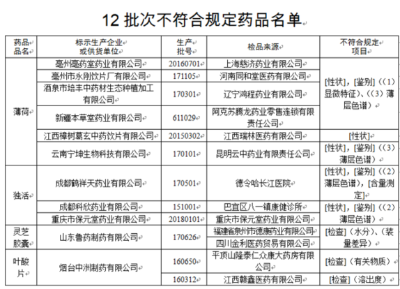 薄荷、灵芝胶囊等12批次药品不符合规定被通告