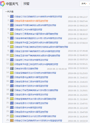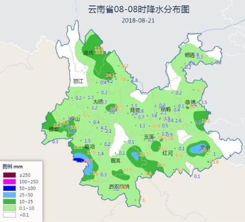 今天云南降雨仍将持续,云南发布25条在线预警,昆明发布暴雨蓝色预警。云南气象台预计,8月21日20时至22日20时丽江南部、大理、保山、德宏、临沧、普洱、西双版纳、昭通、昆明、楚雄、玉溪、红河阴天间多云有中雨局部大雨或暴雨;其它地区多云有阵雨局部中雨。