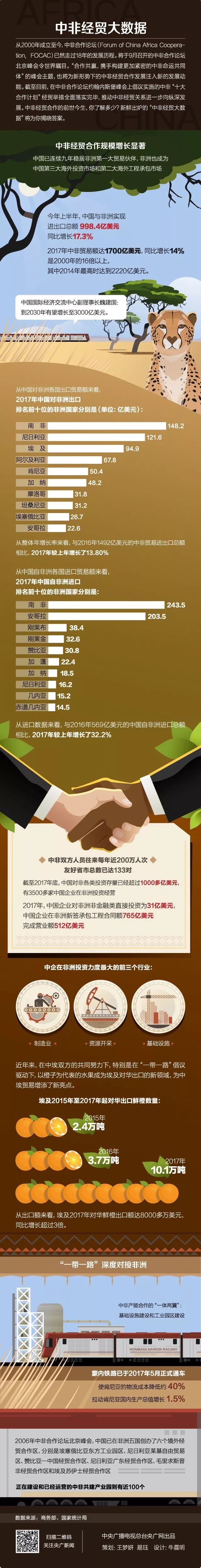 目前,中国已经连续九年成为非洲第一大贸易伙伴国,2017年中非贸易额达1700亿美元,同比增长14%。今年1-6月,中非贸易额达988亿美元,同比增长16%。