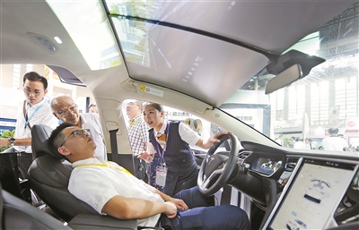 参观者在2017年智博会上体验基于5G网络的未来无人驾驶舱。(崔引 摄)