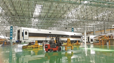 在中国中车宁波产业基地,高铁列车正在生产中。