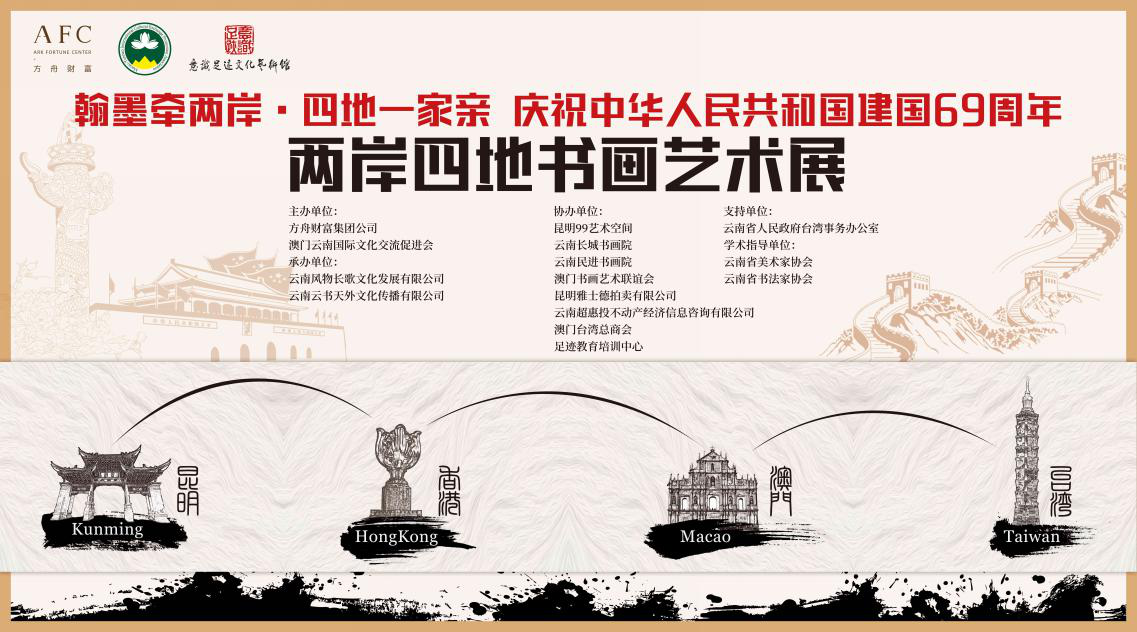 昆明信息港记者 邵元丽 9月11日,“翰墨牵两岸 · 四地一家亲——庆祝中华人民共和国成立六十九周年两岸四地书画”艺术展在昆明市白龙路方舟财富大厦开展。现场,来自香港、澳门、台湾、北京、辽宁、南京、浙江、安徽、四川、珠海等地的书画艺术家齐聚云南,交流互鉴,共同见证仪式的开幕。