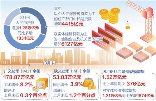 9月12日,中国人民银行发布的8月份金融统计数据显示,8月份社会融资规模增量为1.52万亿元,比上年同期减少376亿元;当月人民币贷款增加1.28万亿元,同比多增1834亿元;8月末,广义货币(M2)余额178.87万亿元,同比增长8.2%。