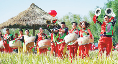 23日,河南省原阳县太平镇水牛赵村农民在稻田间擂鼓起舞,庆祝自己的节日。 新华社记者 李 安摄