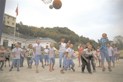 出生于1991年的校长何义稳(中)带着孩子们打篮球。