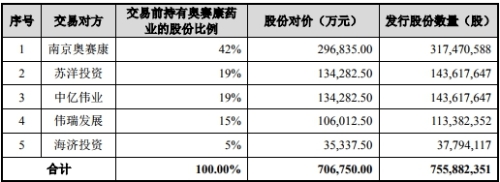 本次交易中,拟置出资产的初步作价为5.40亿元,拟购买资产的初步作价为80.00亿元,上述差额74.60亿元由上市公司以发行股份的方式向奥赛康药业的全体股东购买。