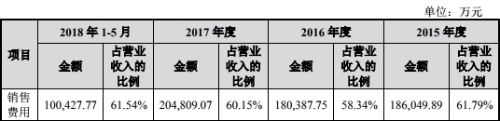 2015年至2018年1-5月,奥赛康药业销售费用分别为186,049.89万元、180,387.75万元、204,809.07万元、100,427.77万元;占营业收入的比例分别为61.79%、58.34%、60.15%、61.54%。