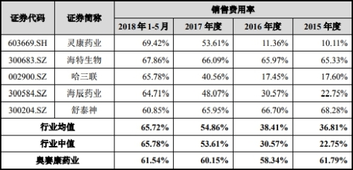 2015年至2018年1-5月,奥赛康药业同行业上市公司灵康药业销售费用率分别为10.11%、11.36%、53.61%、69.42%;同期海特生物为65.33%、65.97%、66.09%、67.86%;哈三联分别为17.60%、17.45%、40.56%、65.78%;海辰药业分别为22.75%、30.57%、48.07%、64.71%;舒泰神分别为68.28%、66.70%、65.95%、60.85%。