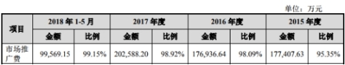 2015年至2018年1-5月,奥赛康药业市场推广费分别为177,407.63万元、176,936.64万元、202,588.20万元、99,569.15万元;占销售费用比例分别为95.35%、98.09%、98.92%、99.15%。