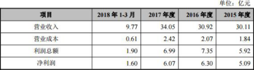 奥赛康药业2015年至2018年1-3月实现营业收入分别为30.11亿元、30.92亿元、34.05亿元、9.77亿元;净利润分别为5.09亿元、6.30亿元、6.07亿元、1.60亿元。