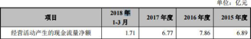 奥赛康药业2015年至2018年1-3月经营活动产生的现金流量净额分别为6.89亿元、7.86亿元、6.77亿元、1.71亿元。