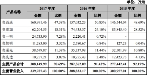 奥赛康药业2015年至2017年主要产品合计收入合计分别为277,442.41万元、282,362.09万元、308,149.99万元;主营营业收入分别为300,957.01万元、308,833.17万元、339,787.43万元。其中,产品奥西康的收入金额分别为146,544.04万元、157,032.23万元、160,991.46万元。占主营营业收入比例分别为48.69%、50.85%、47.38%。