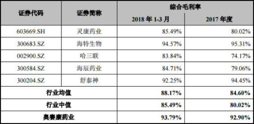 奥赛康药业2015年至2018年1-3月毛利率分别为93.90%、93.31%、92.90%、93.79%。2017年、2018年1-3月行业均值分别为84.60%、88.17%。