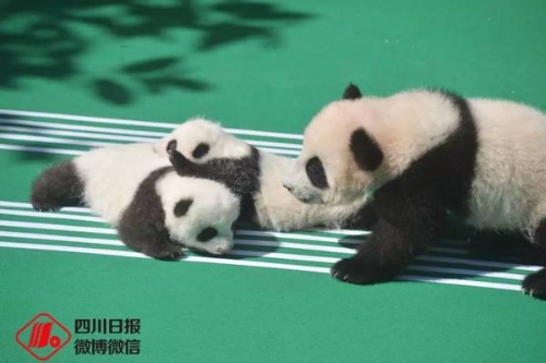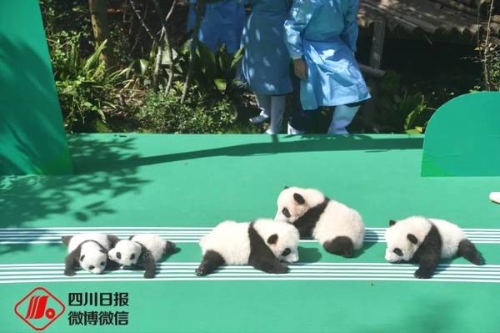 上午10 点30分左右,在成都熊猫基地太阳产房活动场,由7只新生大熊猫宝宝组成的“太阳天团”依次被饲养员抱出场外,7只可爱的大熊猫宝宝有序的趴在画有五线谱的地毯上,黑白相间的大熊猫宝宝好似一个个音符!