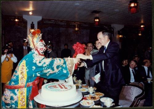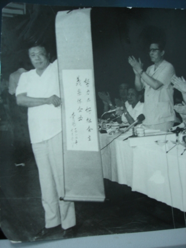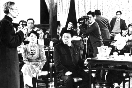 90年代,相声表演大师马三立(左一)与尹盛喜总经理(右二)、京韵大鼓表演艺术家骆玉笙(右一)、京剧表演艺术家李维康等在老舍茶馆进行联谊活动。