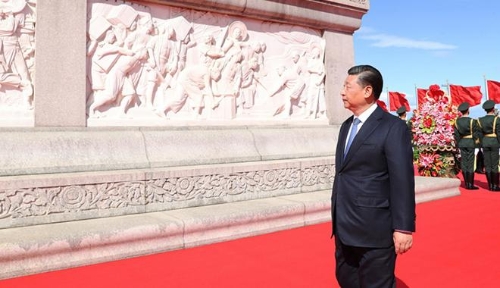 9月30日上午,习近平等党和国家领导人来到北京天安门广场,出席烈士纪念日向人民英雄敬献花篮仪式。这是习近平瞻仰人民英雄纪念碑。图片来源:新华社