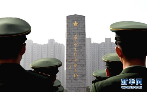 2017年9月30日,武警官兵在河南郑州烈士陵园缅怀先烈。图片来源:新华社