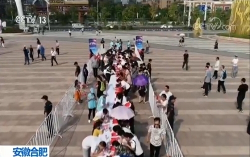 拿起画笔,或精心描画国旗的色彩,或用心写下对祖国的祝福,安徽合肥居民在50米的长卷上,绘制出了一面又一面鲜艳的五星红旗。
