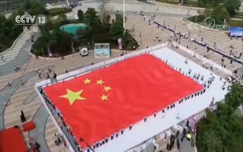 猎猎红旗展,在嘹亮的歌声中,一面长36米、宽24米的巨幅国旗,缓缓展开。