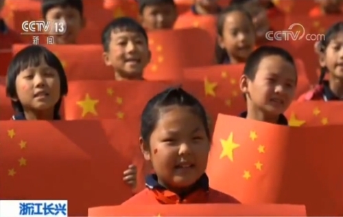 在浙江长兴的多所小学,上千名孩子自己动手,制作五星红旗。剪纸是长兴县 夹浦镇中心小学的教学特色,大家全神贯注,仔细剪出一大四小五个五角星,再按照国旗的标准,小心翼翼地粘贴在红纸上,制成一面面鲜艳的五星红旗。