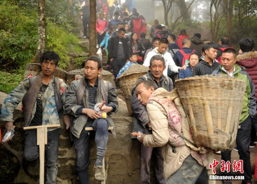 峨眉山金顶背山工的年龄从20多岁到50多岁不等,有男有女。