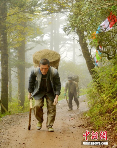 10月5日,海拔3000多米的峨眉山金顶,一些山道阶梯、宾馆正在维修,因无法使用机械,背山工们一次要背200斤左右的建材步行一公里的上行山道,每天往返10余趟。(图片来源:东方IC)