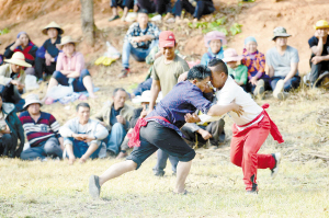 每逢节庆喜事,摔跤都是彝族撒尼人不可缺少的重要内容之一。比赛不分体重、不限时间,只要脱掉上衣蹲在场边、腰系红布带,就是请求参赛的表示。在撒尼村寨最为特别的是,女子摔跤也是一股主力军。开朗强健的撒尼女子也许前一天还在田间劳作或家中刺绣,第二天腰带一系就成了跤场上的女汉子。彝族撒尼人常说,“没有一个彝族男人不会摔跤,没有一个彝族女人不喜欢摔跤。”