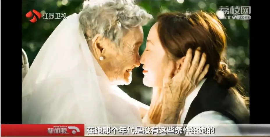 前几天,她带着96岁的奶奶去拍了一组婚纱照,而她则反串了爷爷的角色。照片中的奶奶,宛如时光穿梭一般,回到了少女时代。