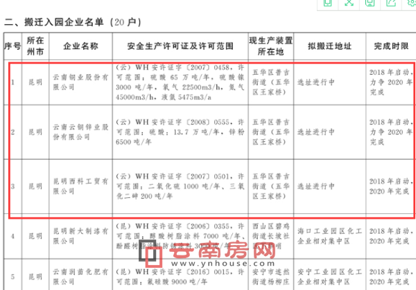 根据《云南省城镇人口密集区危险化学品生产企业搬迁改造名单》,共42家危化品企业被列入了搬迁改造名单,其中要搬迁的企业共20家,包括了位于五华区普吉街道的3家企业:即云南铜业股份有限公司、云南云铜锌业股份有限公司、昆明西科工贸有限公司,这3家公司都是云铜集团旗下的企业,而云铜的前身为昆明人熟知的云南冶炼厂。