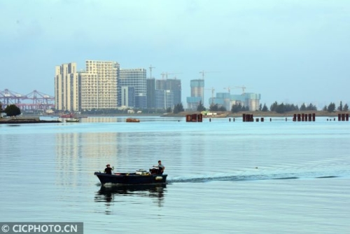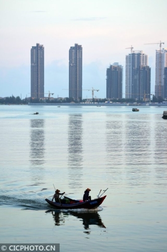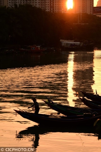 10月23日,海口市的渔民在晨曦中出海归来。CICPHOTO/蒙钟德 摄