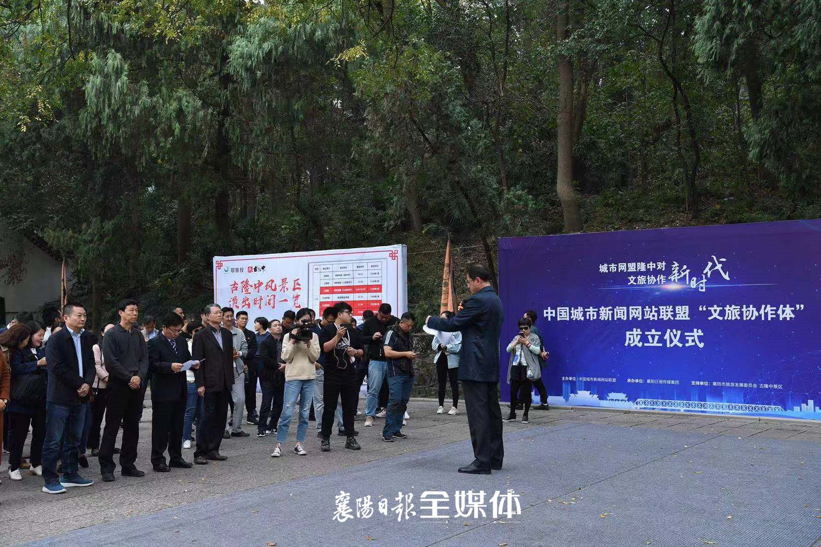 10月24日下午,中国城市新闻网站联盟“文旅协作体”成立仪式在位于湖北省襄阳市襄城区的古隆中景区举行。中国文化管理协会文化旅游专业委员会名誉会长孙瑜、中国城市网盟会长胡宝祥以及来自杭州、青岛、西安等旅游目的地(省)市新闻网站的主要负责人出席成立仪式。