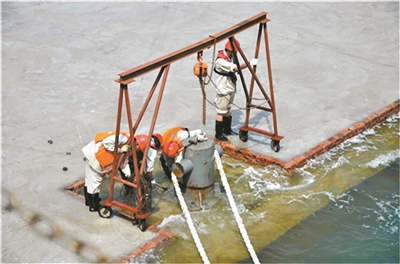 一节重约8万吨,相当于一艘中型航母重量的标准沉管,在10艘大马力拖轮的牵引及数十条警戒船护卫下,浩浩荡荡驶往沉管安装现场。和煦的春风拂过,温暖的阳光洒落在施工船面上忙碌的工人身上。在沉管浮运途中,何志军“爷孙仨”带着工具走到“津安3”安装船的甲板上,打量着沉管顶板上的缆桩。“我们的工作是一条龙,管节浮动前进行二次舾装,不仅要把沉管顶上的那些东西装好,还要把管节里面的那些观测设备、照明线路装好,这些工作不能有半点马虎;沉管浮运到位后又要抓紧把管顶上该拆除的物件迅速拆除,以最短的时间完成沉放准备;沉管安装到位后,我们又把里面的那些管线、设备拆除……”虽然到项目工地上不久,何志军介绍起工作来头头是道。
