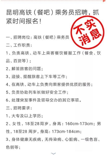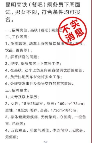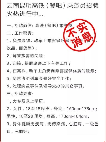 网传昆明铁路局集团公司招聘高铁岗位工作人员为假消息