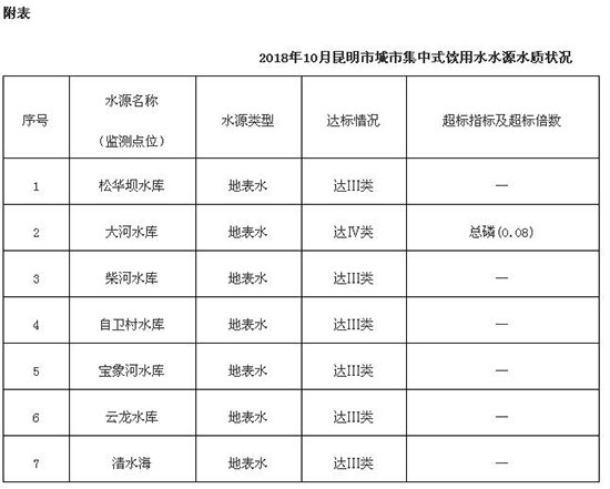 昆明信息港讯 实习记者周硕 2018年10月,昆明市主城区共监测7个在用集中式生活饮用水水源,均为湖库型地表水水源。7个在用集中式生活饮用水水源监测结果,除大河水库达Ⅳ类水外,其余6个均达到或优于Ⅲ类水标准,达标率为85.7%。