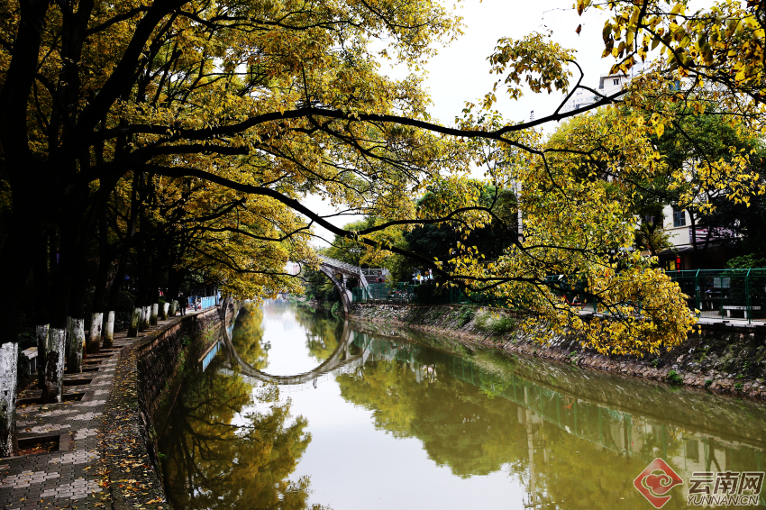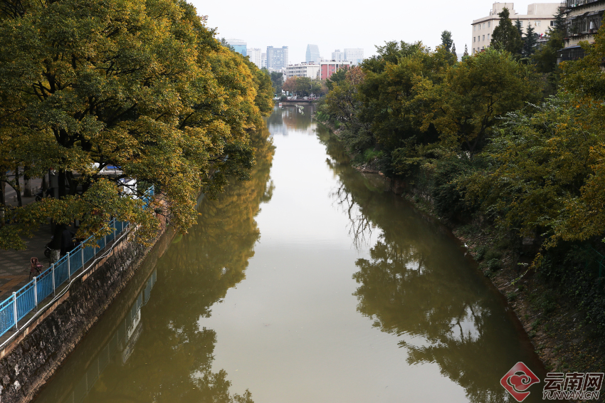 秋末的昆明大观河,两岸老滇朴树在阳光下透出金灿灿的轮廓,水面上有成双成队的白鹭飞过。