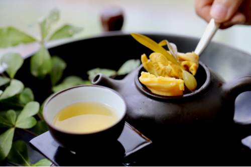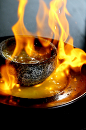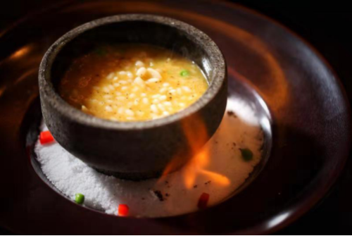 吴玉擎师傅入行19年,曾获得多项行业大奖,包括中国烹饪大师、粤港澳五星名厨、羊城金厨奖等。一直以来,吴师傅保持着对美食与烹饪的一腔热诚,要求出品味与美二者兼具。他结合健康养生的饮食观念,首度推出松露酱滑珍珠烩花胶。一圈橙黄色火焰围着深灰色石窝跳动,在菜品上桌的那一刻便吸引了所有注意力。高温加速了分子运动,下一秒黑松露的独特香气已窜入鼻端。颜色诱人味道醇和的金瓜汁与口感弹牙的珍珠米让每一口都成为了享受。