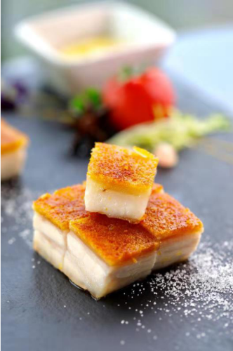 御公馆推荐每桌必点的招牌菜之一黑毛猪烧肉,有着橙红色的脆皮与奶白色的腩肉。一口咬下去能清晰听见脆皮传来的声音,腩肉入口即化、油而不腻。黑毛猪烧肉来自于藏在大山里面的美味。为了确保供货源的稳定,吴师傅亲身去到贵州从江黑毛猪基地考察。良好的生长环境、被严格的产量以及层次丰富的口感,一下便打动了他。然而这样的美食却不可多得,一只黑毛猪只有2-3kg的精选五花腩肉,让每一口烧肉都显得弥足珍贵。可以为了口感而苦寻数年,为了美食而跋涉千里,在吴师傅身上体现的是常怀谦卑之心不断学习的匠人精神。