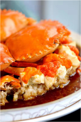 手剁香猪肉饼蒸膏蟹,御公馆顺节应季推出吴师傅的时令菜品。选择个头在一斤半左右的膏蟹,加入糖份较高的陈年太雕酒提鲜去腥驱寒。精选肥瘦相间的黑毛猪五花腩肉,手剁肉饼保持肉的爽滑质感,并佐以顺德驰名爽口的均安大头菜与荸荠提味。看似平平无奇的一道家常蒸菜却要求厨师对时间有着精准的把握,蒸九分钟,多一分钟则口感欠佳,少一分钟则鲜味不足。高温猛火蒸过的肉饼充分吸收了蟹肉的鲜味以及蟹膏的甘香,汁水丰盈入口鲜爽。细细体会之下,还能感受到黄酒甜味萦绕于舌尖。