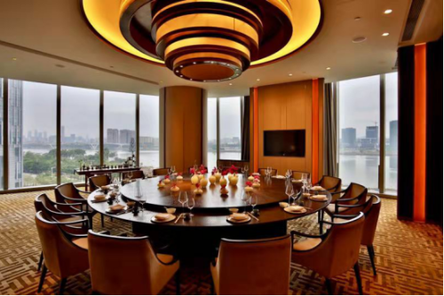 御公馆内14个厅房体现中国五行的先行与睿智,面江厅房带给您尊贵的体验。餐厅内中式古典设计,安静雅致用餐环境是家人朋友聚餐与商务宴会的佳选。