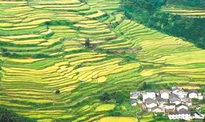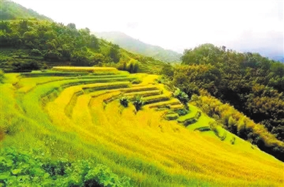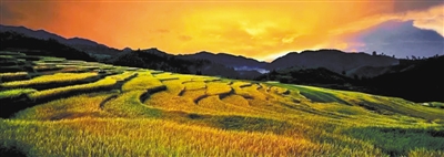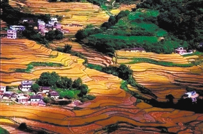 层层叠叠的梯田,时有微风拂过,沉甸甸的稻粒随风跳动,给人以无限生机的视觉享受。从远处望去,蜿蜒柔和的线条排列在一起,犹如大地的指纹,金灿灿的水稻铺满整个山坡,加上梯田间间或伫立的小屋,构成一幅美丽醉人的田园风光画。