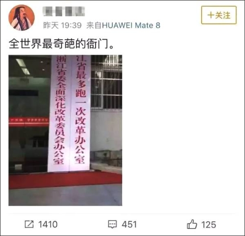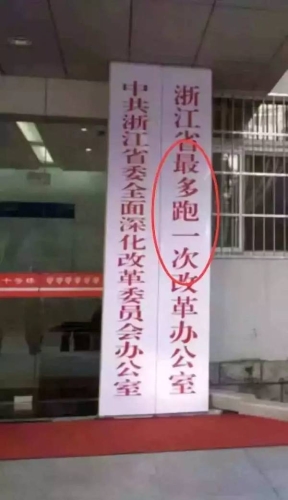 近日,一位网友在微博上晒出了浙江某政府单位的招牌,只见右边的那块招牌上写着:“浙江省最多跑一次改革办公室”。这张照片发布后,迅速获得了大量网友的转发、点赞。