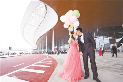六对建设者夫妻回港珠澳大桥珠海公路口岸补拍婚纱照。