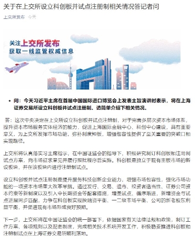 14:54分,上交所发布关于在上交所设立科创板并试点注册制相关情况答记者问表示,科创板是独立于现有主板市场的新设板块,并在该板块内进行注册制试点。