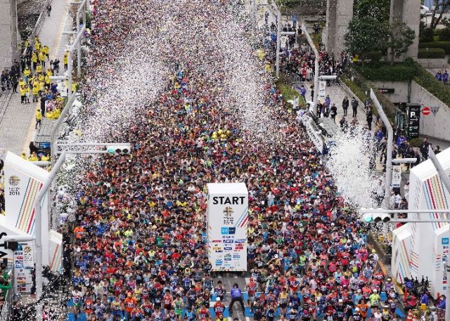 2018年2月25日,东京马拉松参赛者从起跑处出发。
