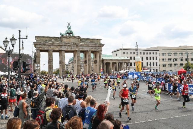 9月16日,2018柏林马拉松赛参赛者经过勃兰登堡门。新华社记者单宇琦/摄